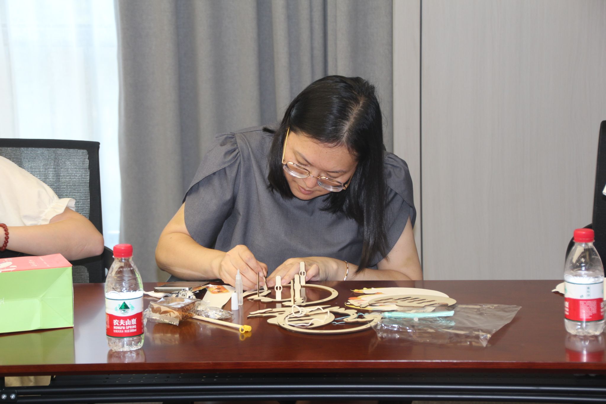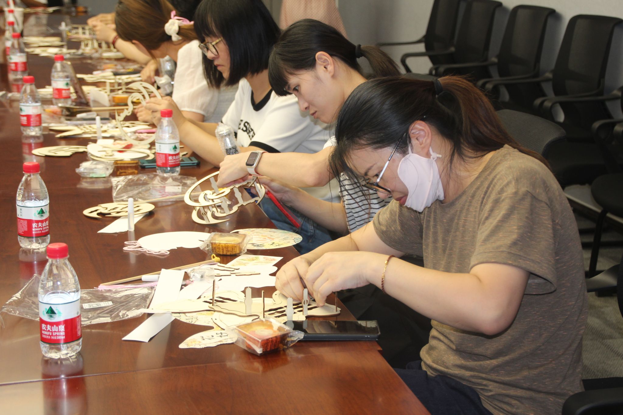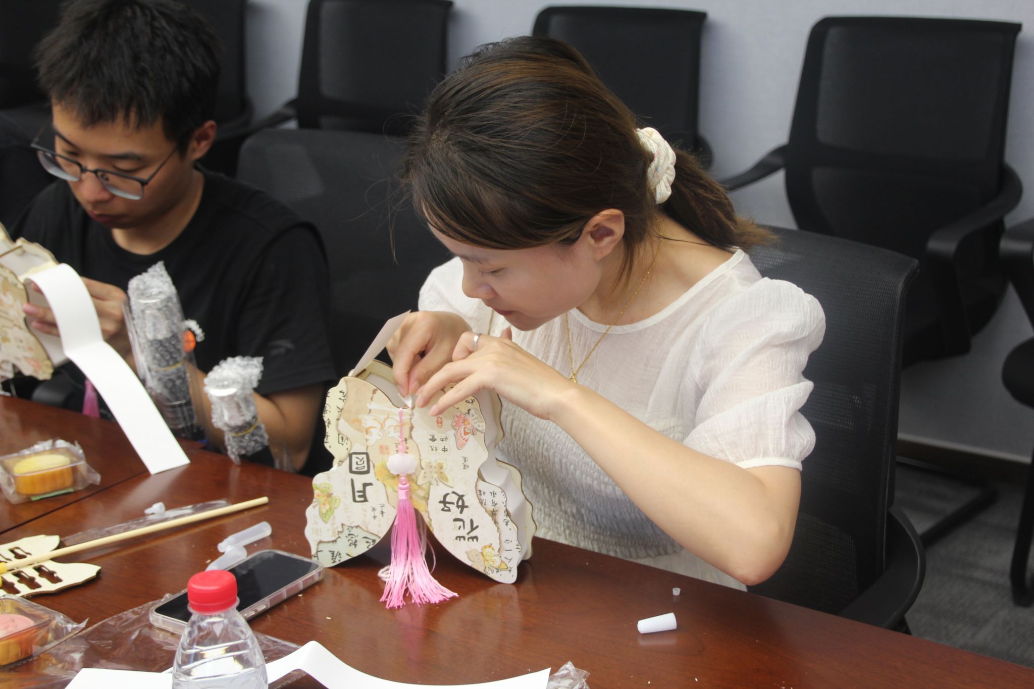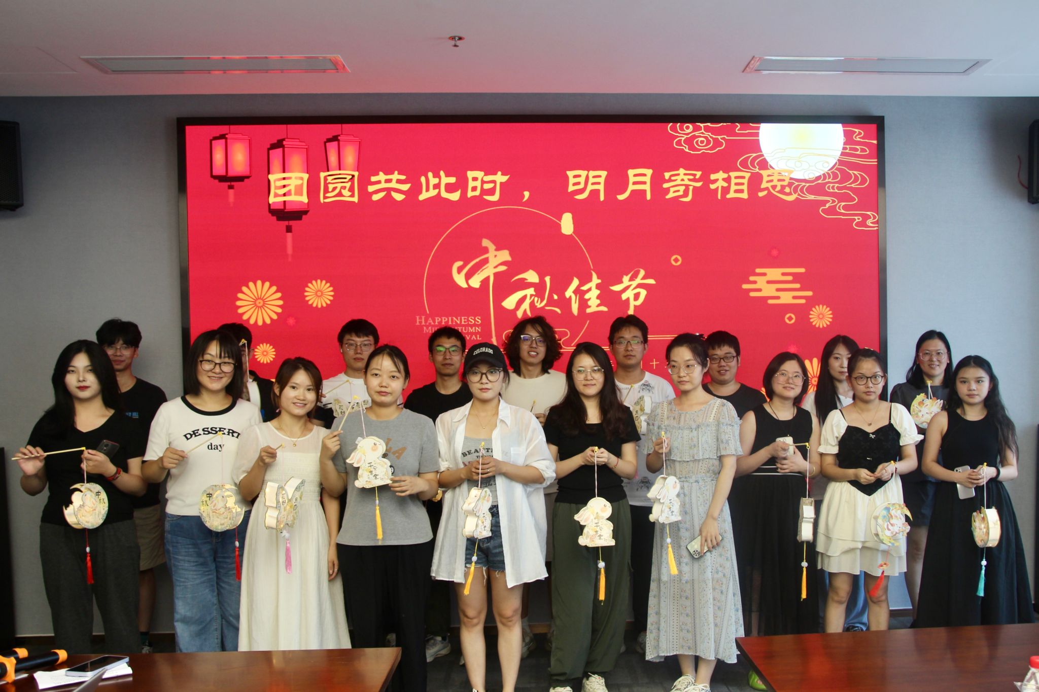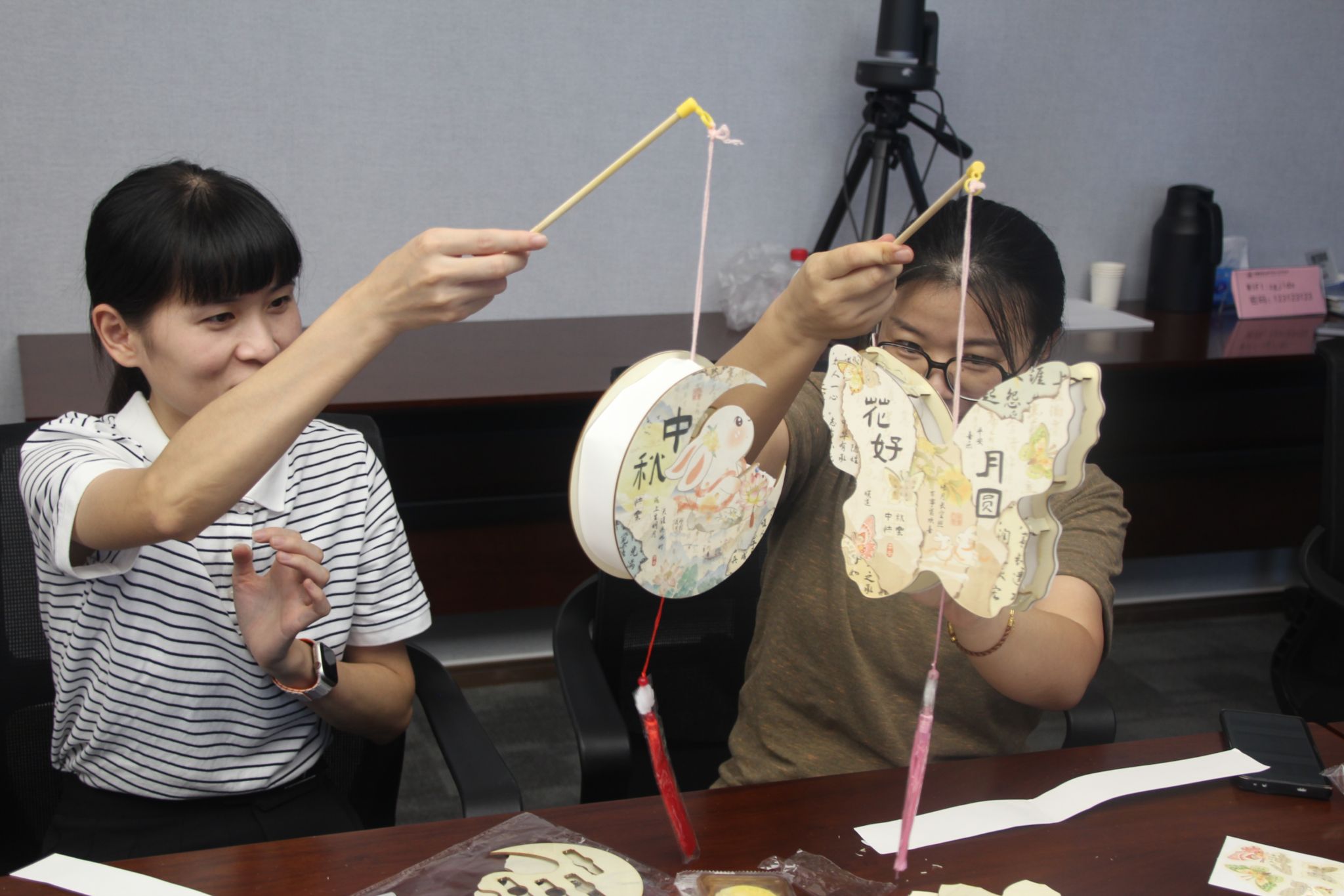 中秋节作为我国传统节日,寄托了人们祈盼风调雨顺、团圆幸福的美好向往,中秋节期间制作花灯,不仅是对传统文化的传承,也是家人团聚、共赏明月的一种方式。本场活动的第二个环节集体做花灯更是将现场气氛推向了一个高潮。大家按照教学视频,互相交流,相互帮助,系上流苏,装好灯带,经过一番巧手制作,一个个象征着阖家团圆、暖意浓浓的古风灯笼陆续呈现。