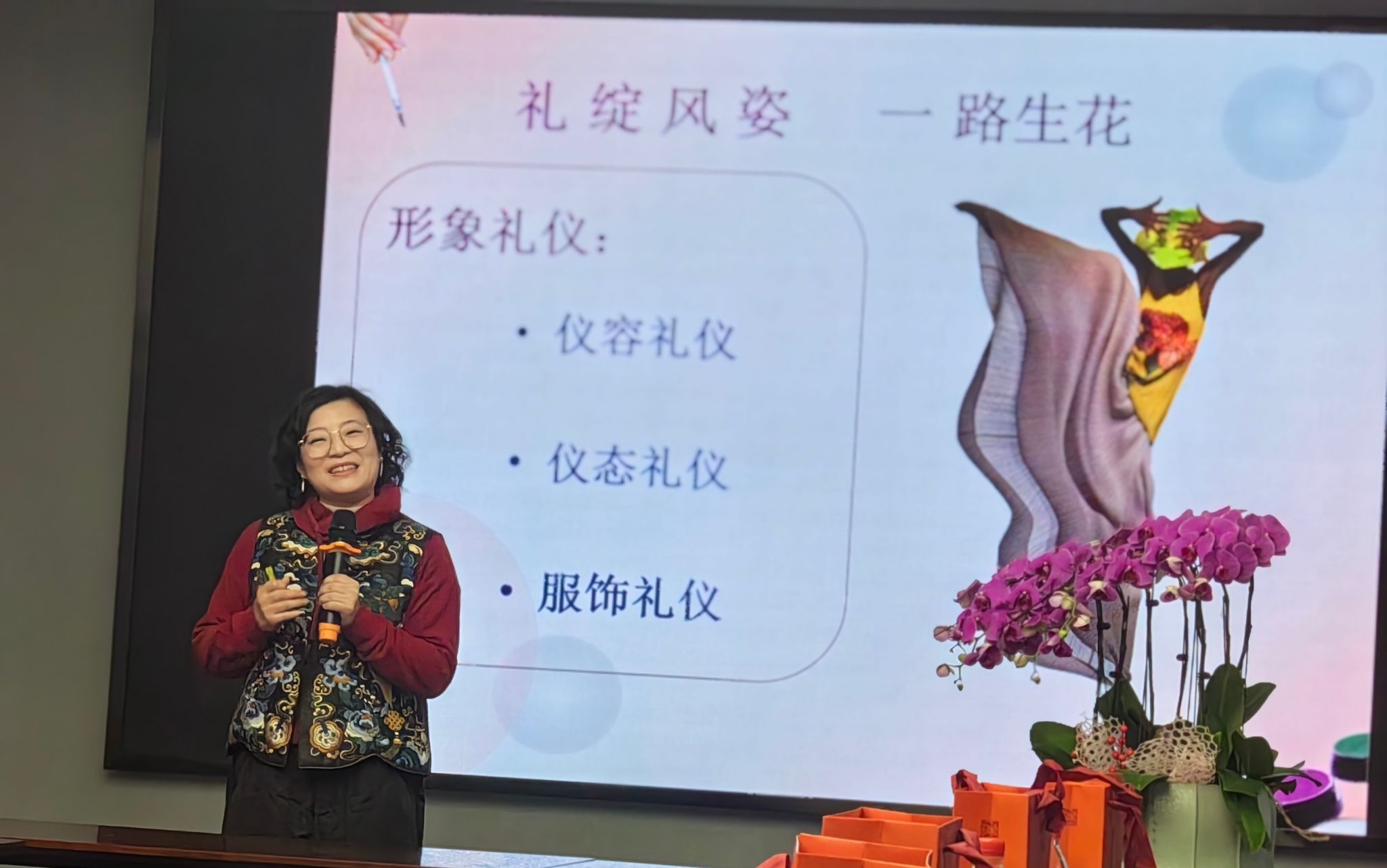 活动伊始,主持人向所有在场的女教职工和企业代表致以节日的问候和美好的祝福。本次活动特别邀请了杭州市公共关系协会公共关系研究中心主任、我校艺术与传播学院教授孙倩老师,为大家带来了一场生动实用的日常穿搭和职场礼仪讲座。老师从色彩搭配、款式选择、场合着装等方面入手,深入浅出地讲解了如何打造得体优雅的职业形象,并现场示范了规范的站姿、坐姿、妆容技巧等实用技能。现场女神们认真聆听,积极参与互动,现场气氛热烈融洽。