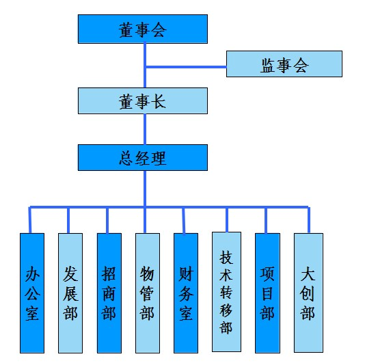 董事会、监事会、董事长、总经理、办公室、财务室、招商部、物管部、发展部,技术转移部,项目部,大创部。见公司管理组织机构设置图及各部门职责如下: