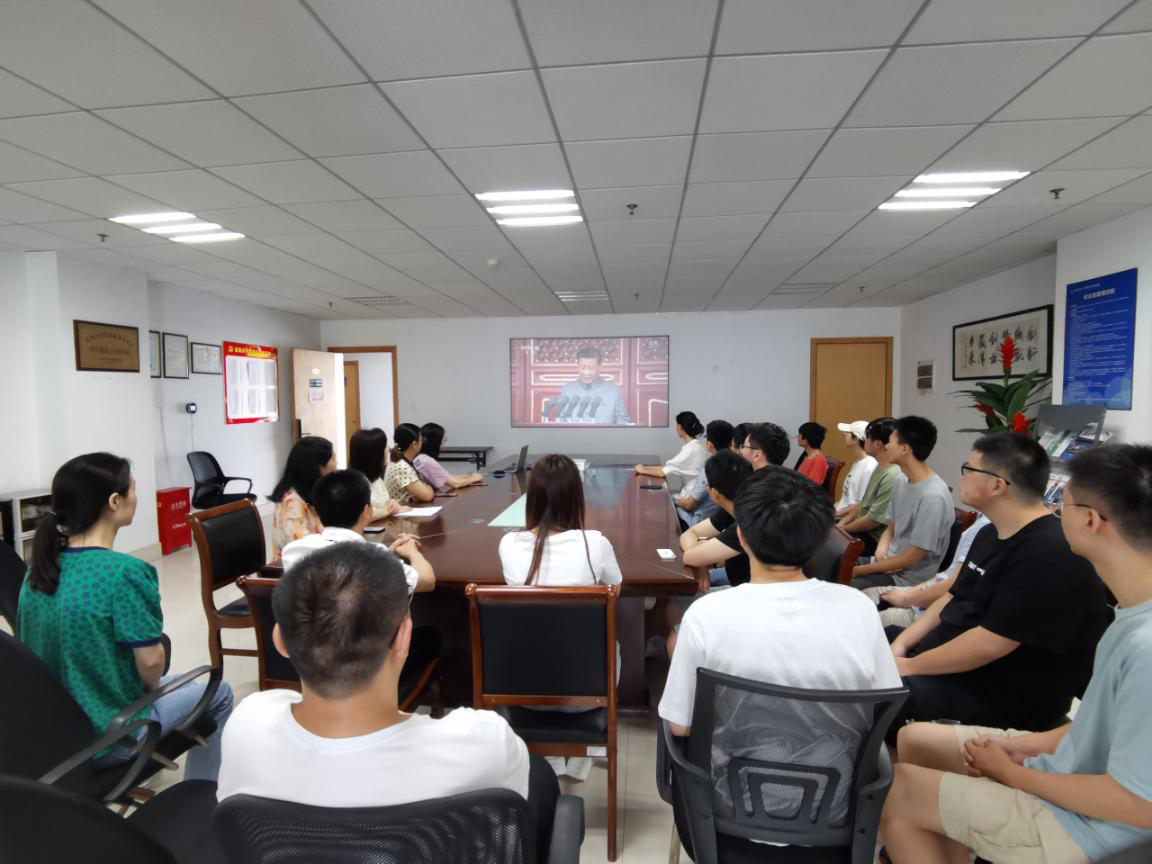 7月1日上午8时,庆祝中国共产党成立100周年大会在天安门广场隆重举行,中共中央总书记、国家主席、中央军委主席习近平出席并发表重要讲话。园区企业党员、群众在逸夫楼1008室共同观看了本次大会的网络直播,聆听、学习了习近平总书记在建党100周年的重要讲话。