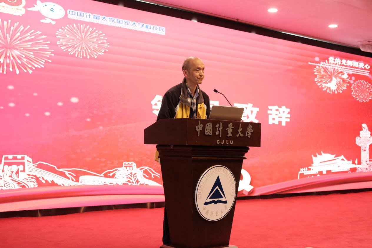 杭州钱塘区社发局二级调研员陈平致辞。浙江省新四军历史研究会宣讲团副团长施红光为杭州市大学生创业园(中国计量大学)授“星火孵化园”旗。